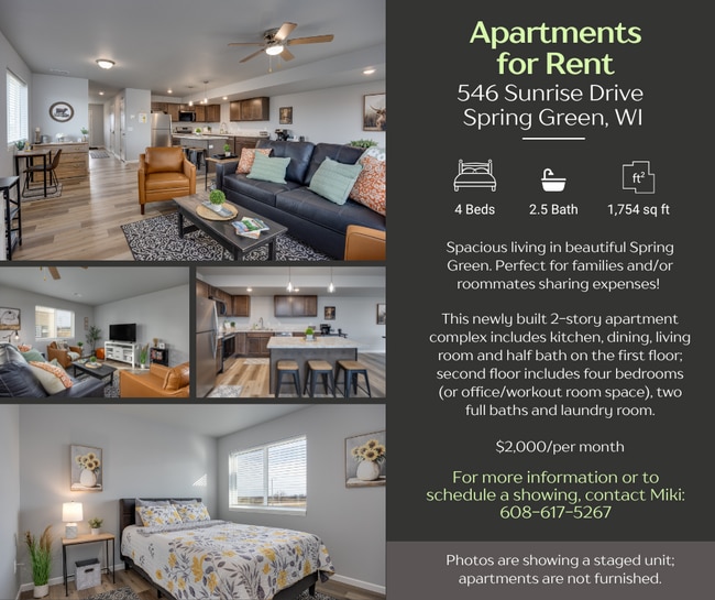 Newly built, 4-bedroom, 2.5 bathroom, two-story apartment unit in Spring Green! $2000/month, $2000 security deposit, available now!Attached, one-stall garageTwo off-street parking stallsIn-unit laundry on second floor near bedroomsPrimary suite with walk-in closet and full bathroomDog friendly (with pet security deposit and pet fees)